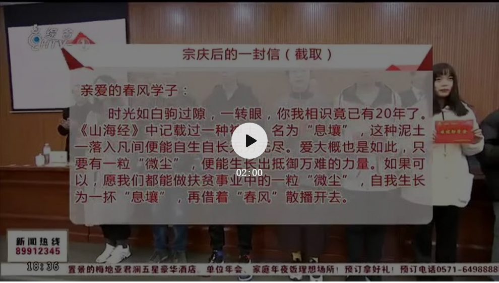 宗庆后表示:“娃哈哈是杭州土生土长的企业,创业以来一直十分重视教育。我们开展春风助学、助岗活动,目的就是要让更多人拥有平等的人生出彩的机会。”